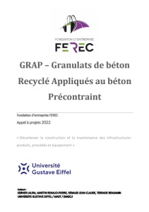Auteurs : KERNER LAURA, MARTIN RENAUD-PIERRE, RENAUD JEAN-CLAUDE, TERRADE BENJAMIN UNIVERSITE GUSTAVE EIFFEL / MAST / EMGCU GRAP – Granulats de béton Recyclé Appliqués au béton Précontraint Fondation d’entreprise FEREC Appel à projets 2022 « Décarboner la construction et la maintenance des infrastructures : produits, procédés et équipement »